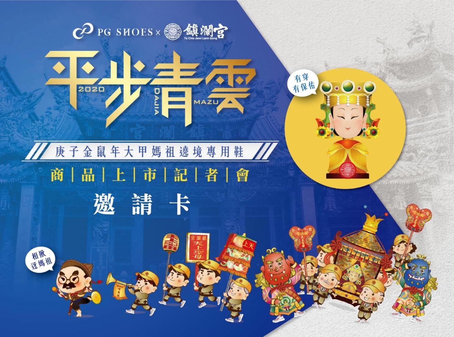 「大甲媽遶境平安專用鞋-平步青雲」擁有三大特點:緩震減壓護膝健康功效、耐磨防滑除臭舒適功能、防水透氣無毒環保訴求等。該產品由【強震科技有限公司-PG SHOES】總代理並於12/10上市宣傳記者會中正式亮相,預期市場上將掀起一波搶購熱潮。即日起可在【大甲鎮瀾宮廟庭廣場-媽祖遶境宣傳快閃店】與PG SHOES官網、蝦皮商城均可購買。