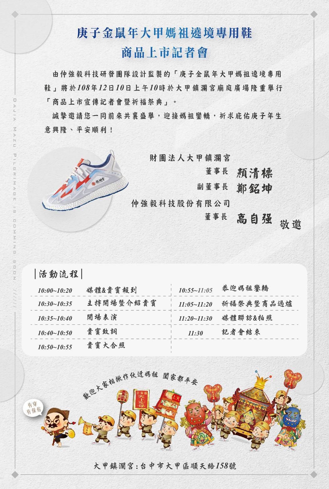 研發製造商仲強毅科技以全球首創「彩色立體定位印刷」已獲得國家專利的製鞋方法,造就獨步全球的「可量產客製化」技術,與大甲鎮瀾宮聯名打造史上第一雙遶境專用聯名鞋款,採用全新材料和技術的開發,不但整合了既有的傳統產業鏈,並將科技新技術注入古老的製鞋工藝中,更是開啟了鞋業製造技術的新紀元。未來也將秉持著對大甲媽祖的信念與感恩,堅持做出台灣製造、好品質,滿足廣大消費者的需求!